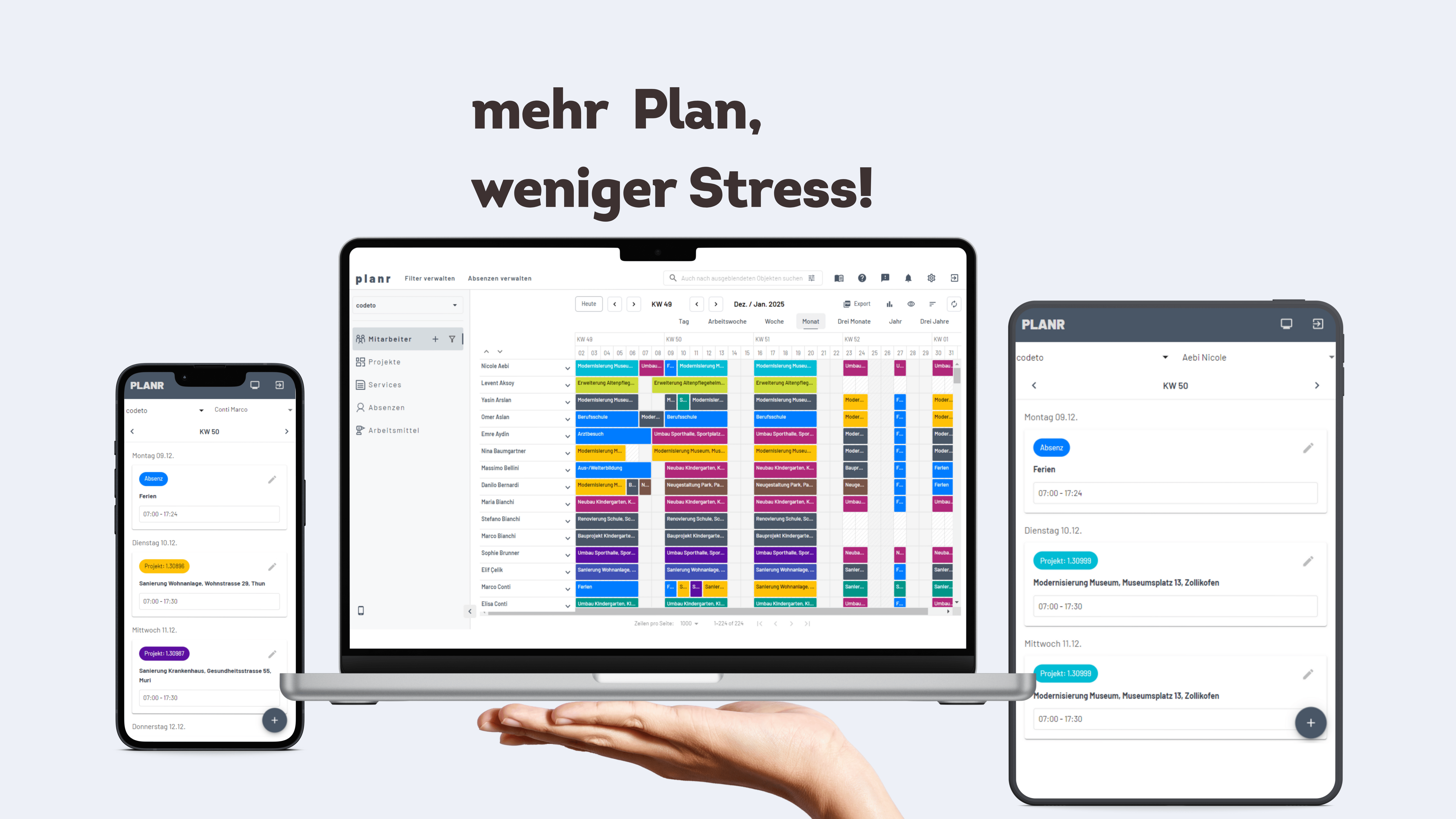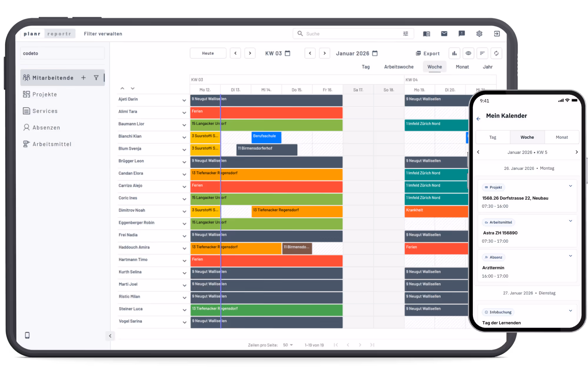 Mit codeto plan planen Unternehmen Einsätze, Ressourcen und Kapazitäten einfach und übersichtlich. Verfügbarkeiten, Auslastung und Absenzen sind jederzeit sichtbar und lassen sich flexibel anpassen.