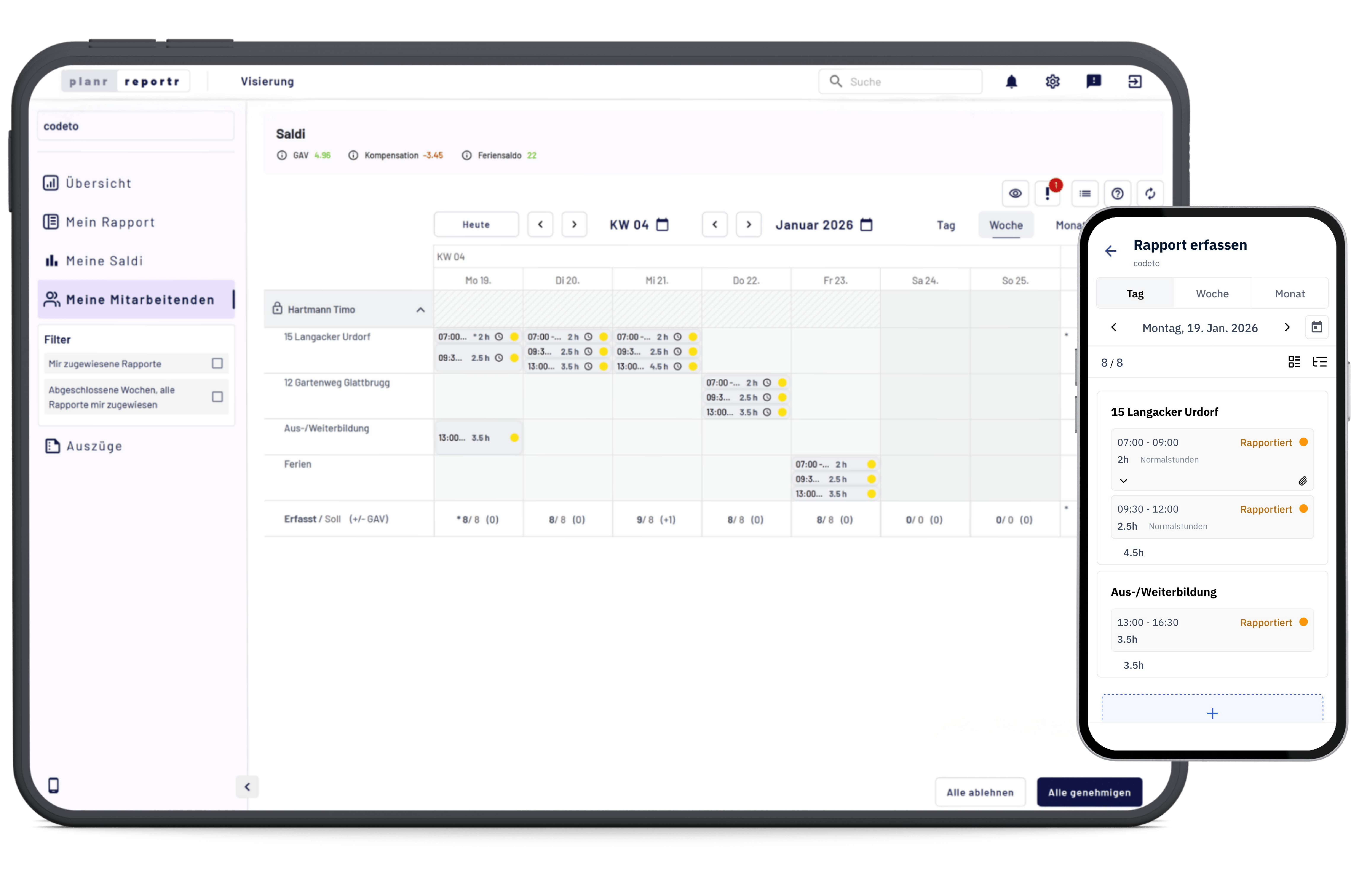 codeto plan und codeto report können bereits heute auf derselben Plattform genutzt werden. Die inhaltliche Verbindung von Planung und Zeiterfassung wird aktuell entwickelt und ist ab Frühjahr 2026 vorgesehen.